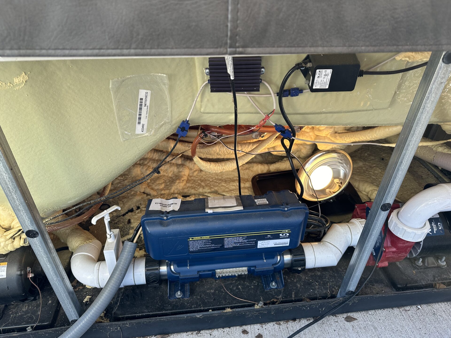 No sweat, you can easily create a warm environment for your hot tub’s equipment compartment that will prevent freezing in the event that you don’t have the ability to power on your hot tub because it’s empty or not working correctly and in need of service. The best thing you can do is to get an exterior grade contractor’s work lamp and run a drop cord out to the equipment compartment. Check out the photo below as an example. Tuck the light in the equipment bay near the hot tub’s pumps but be careful that the light is not coming into contact with any insulation or material that might be a fire hazard. An exterior flood light or warming/heat lamp is a good choice. Run a drop cord to your power outlet and you are all set. Close the cabinet as best you can so all the heat stays inside. This will create just enough heat to prevent freezing in the plumbing lines and equipment.